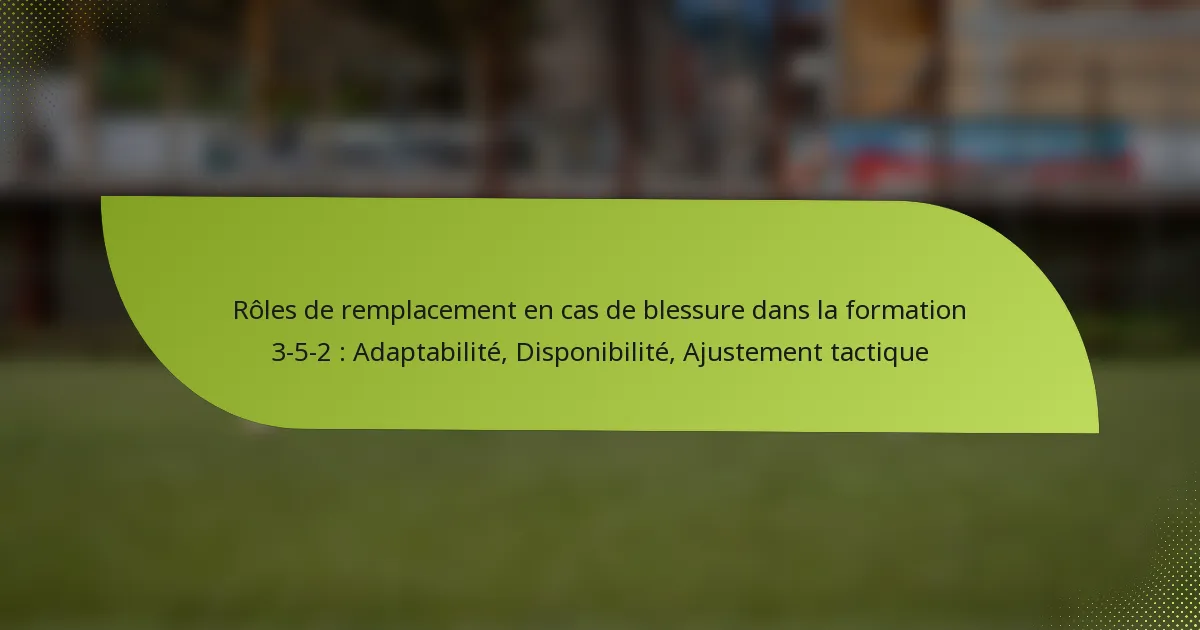 Dans la formation 3-5-2, les rôles de remplacement en cas de blessure sont essentiels pour maintenir la dynamique et la performance de l’équipe lorsque des joueurs clés sont indisponibles. Les remplaçants efficaces doivent posséder l’adaptabilité et la compréhension tactique nécessaires pour s’intégrer parfaitement dans la structure existante, garantissant ainsi que la stratégie de l’équipe reste cohérente. En tirant parti de la polyvalence des joueurs et en améliorant la communication, les équipes peuvent surmonter les défis posés par les blessures tout en conservant leur avantage compétitif. Quels sont les rôles de remplacement en cas de blessure dans la formation 3-5-2 ?…
